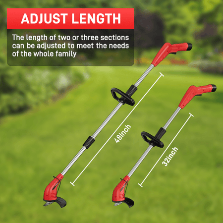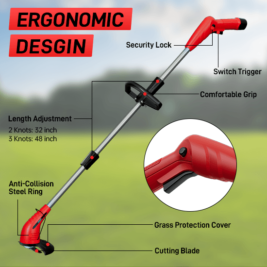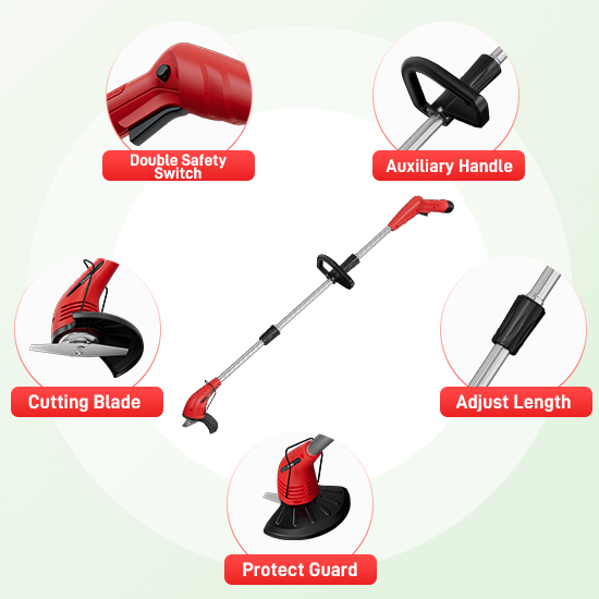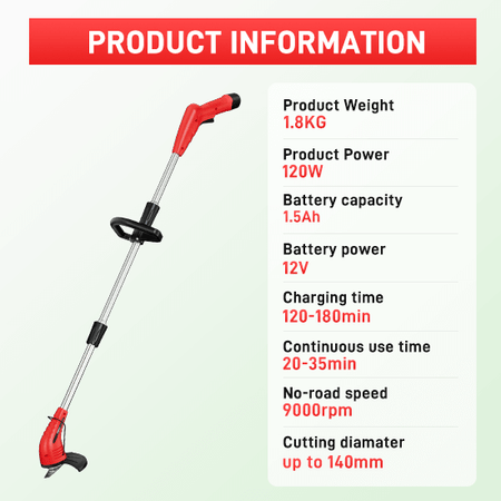 This cordless grass trimmer is a great aid for everyday garden repairs and gardening. It is suitable for mowing lawns, trimming grass edges, and cleaning weeds on a daily basis.