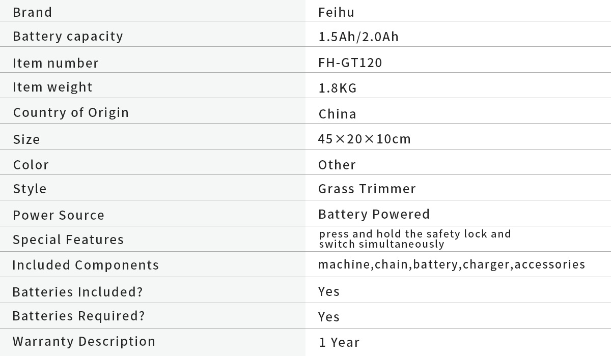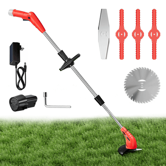 - Included Component: 1 x 12V cordless grass trimmer, 1 or 2x 1.5Ah lithium battery, 1 x charger, 3 x plastic blades , 1 x carton