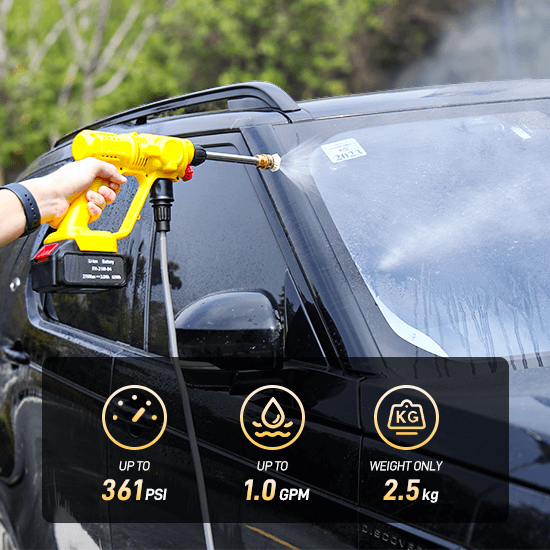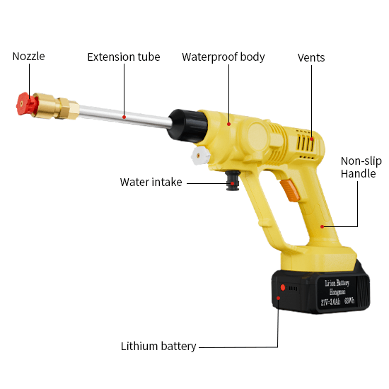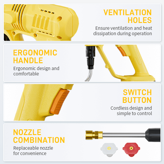 This cordless high-pressure car wash gun brings great convenience for daily garden cleaning and vehicle cleaning, suitable for washing garden tools, west washing, car washing, watering flowers and outdoor furniture cleaning.