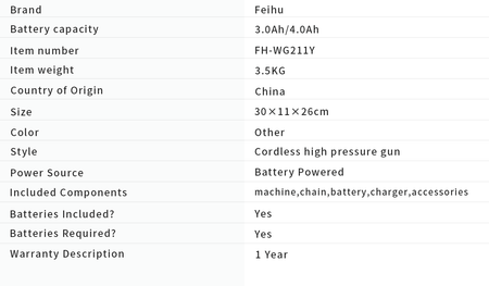 - Included Component: 1 x cordless pressure washer, 1 or 2x 3.0Ah/4.0Ah lithium battery, 1 x charger, 1 x 16 feet draw hose, 2× plastic nozzle, 1 x tool box