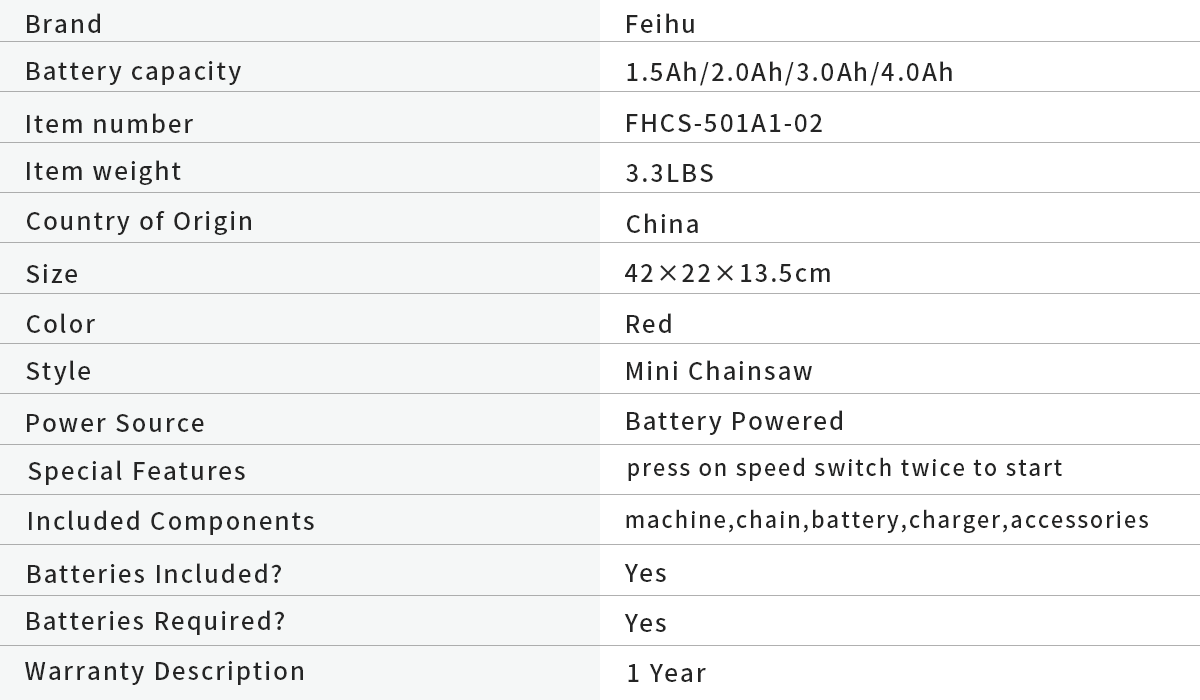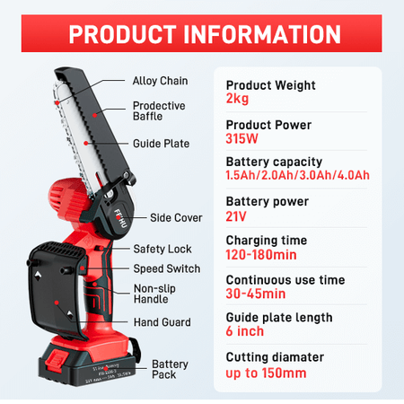 - Included Component: 1 x Mini Chainsaw 6-inch ,1 x 6 inch Guide Plate(Installed) ,1 x Chains (One Installed), 1 or 2 x 21V 1.0Ah/2.0/Ah/3.0Ah/4.0Ah Lithium-ion Batteries ,1 x Charger ,1 x Tool Box ,